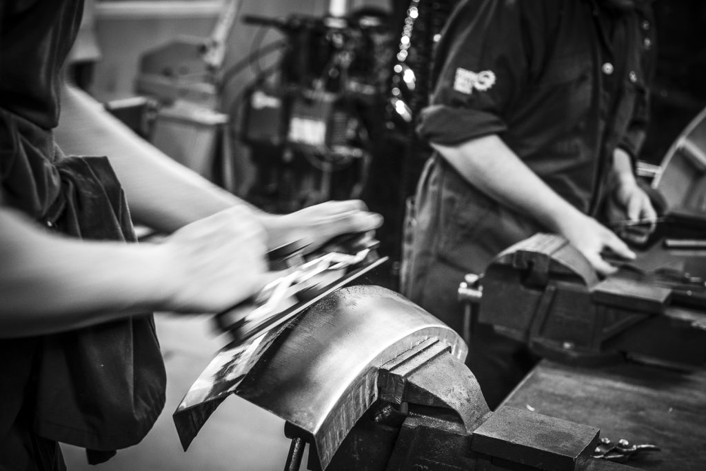 Being part of a commercial workshop often means working together as a team. While certain things are done by a person working individually, often they are contributing to an overall project. At the Heritage Skills Academy the students will make a section working solo, but it will then be welded with all the other pieces to make a finished front wing for example.
